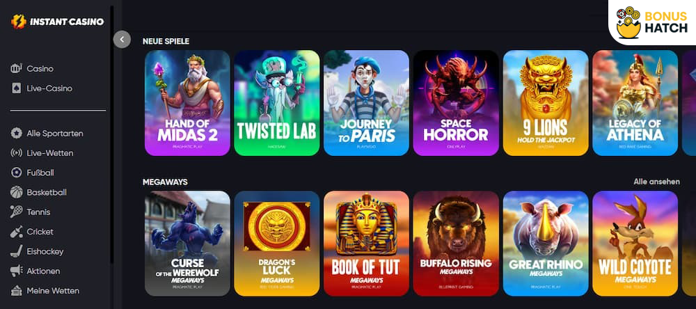 Im Instant Casino findest du eine enorme Anzahl von Spielen – viele Tausend Slots, Tisch- und Live-Games. Hier sorgen die prominentesten Anbieter für eine breite Vielfalt: NetEnt, Pragmatic Play, eZugi, Evolution Gaming, Elk Studios, Novomatic und viele andere. Eine feine Auswahl, in der bestimmt nie Langeweile aufkommen wird.